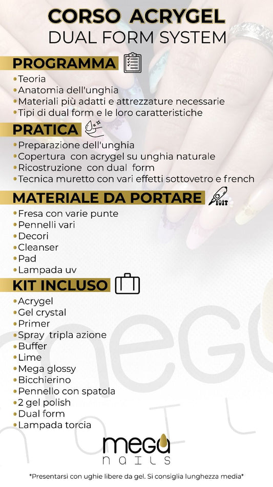 Il corso offre sia una parte teorica che pratica, fornendo gli strumenti necessari per lavorare con Acrylgel.